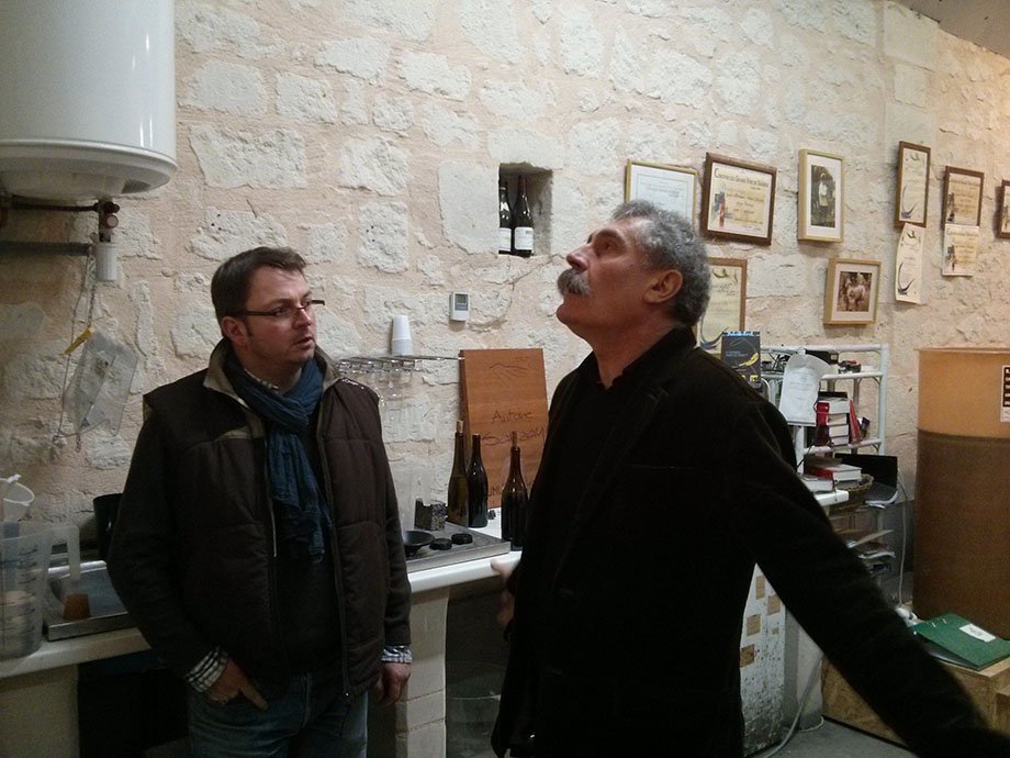 Ancora in preda ai fumi del godimento derivante dal matrimonio d’amore tra andouillette 5 A e Le Bourg 2009, sulla strada del ritorno mi lancio senza paracadute e chiedo a Nady Foucault: “C’è qualche produttore in cui si può in qualche modo ritrovare lo stile Clos Rougeard?”. Segue qualche interminabile attimo di silenzio prima che il baffuto vigneron risponda, secco come una sentenza: “Gira a destra”. Ecco, ora mi porta in una vigna e se va bene mi abbandona giustamente là per la notte a ripensare al concetto degli interrogativi inopportuni. E invece dopo un paio di curve e un tratto di ghiaia siamo davanti ad una piccola cantina, da cui esce un giovane dall’aria tanto sorpresa quanto decisa.