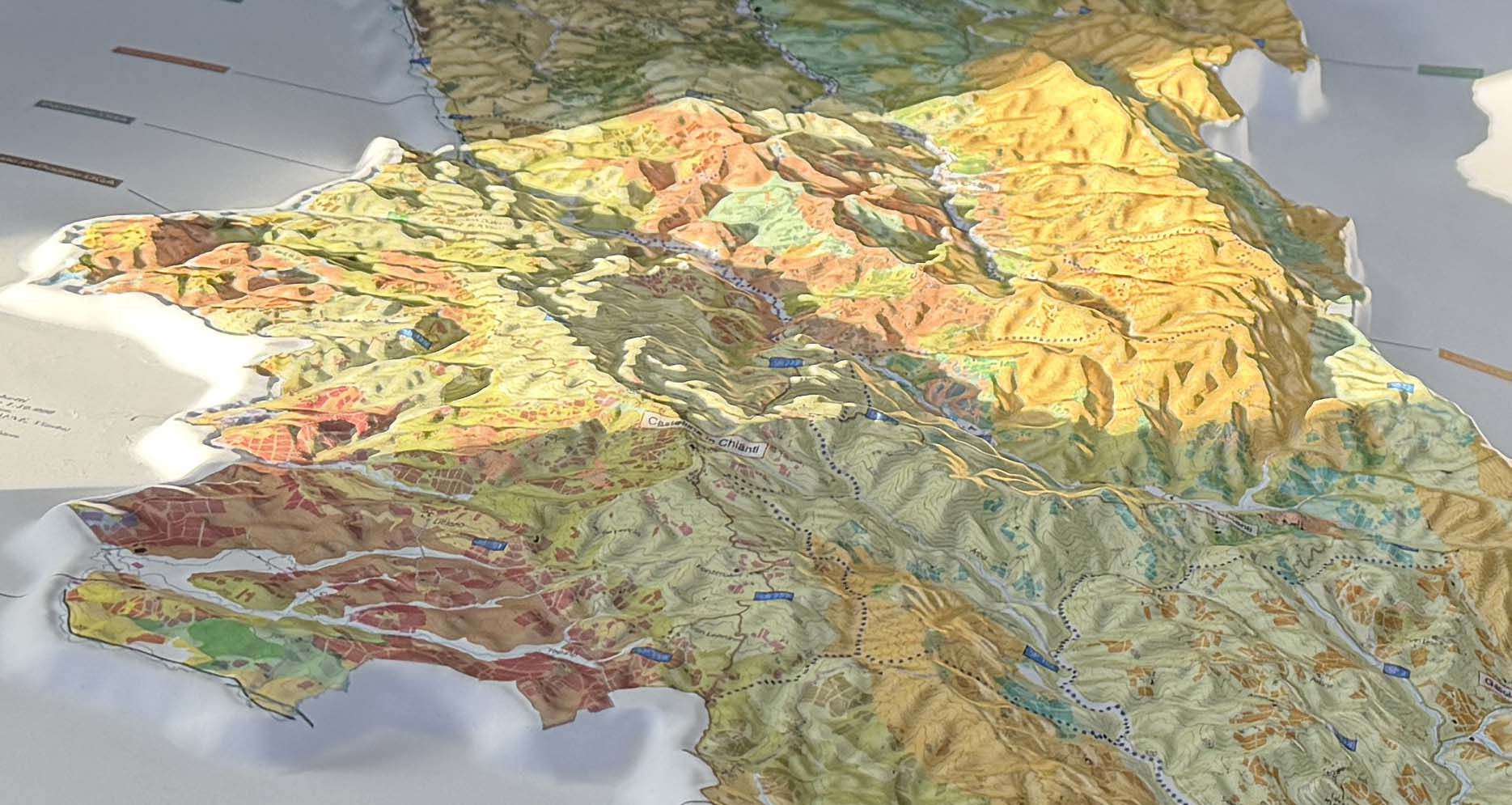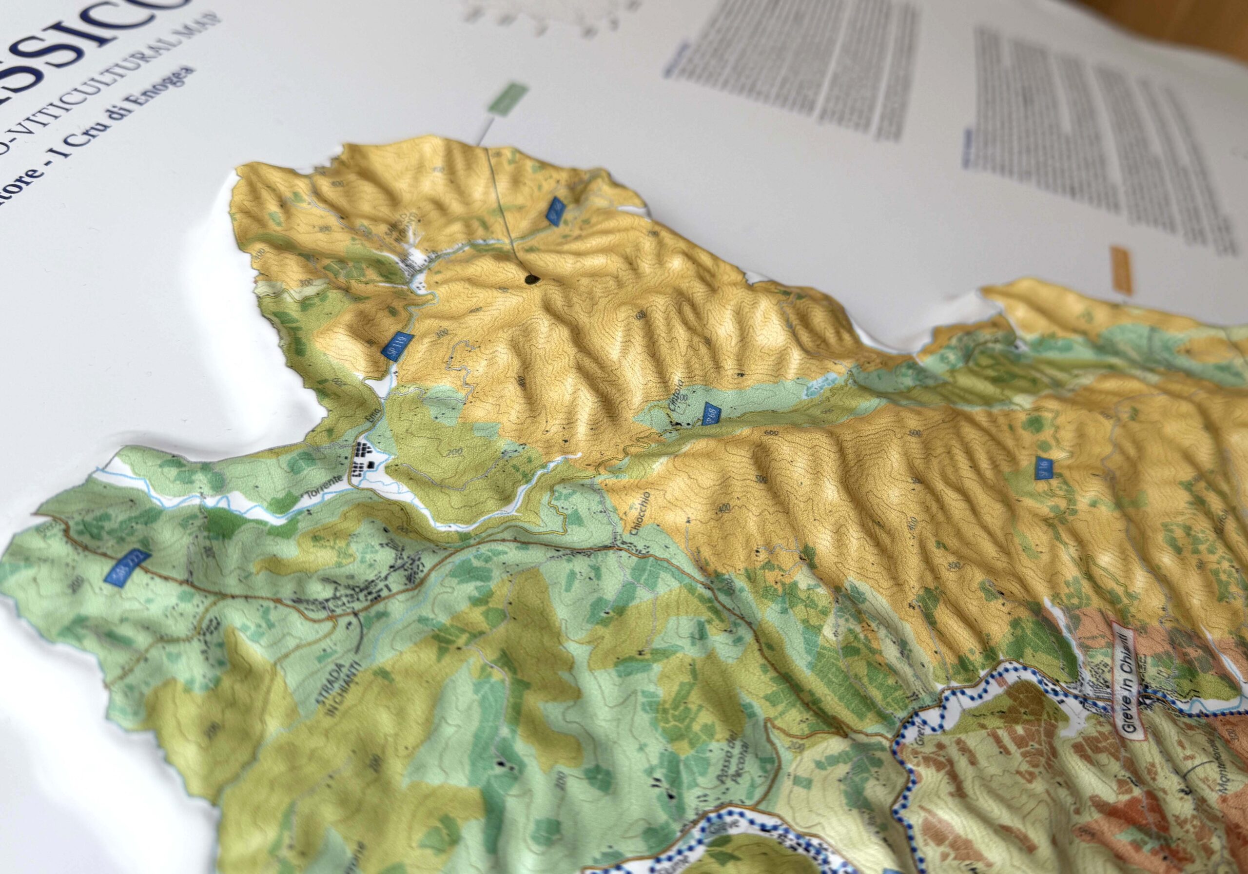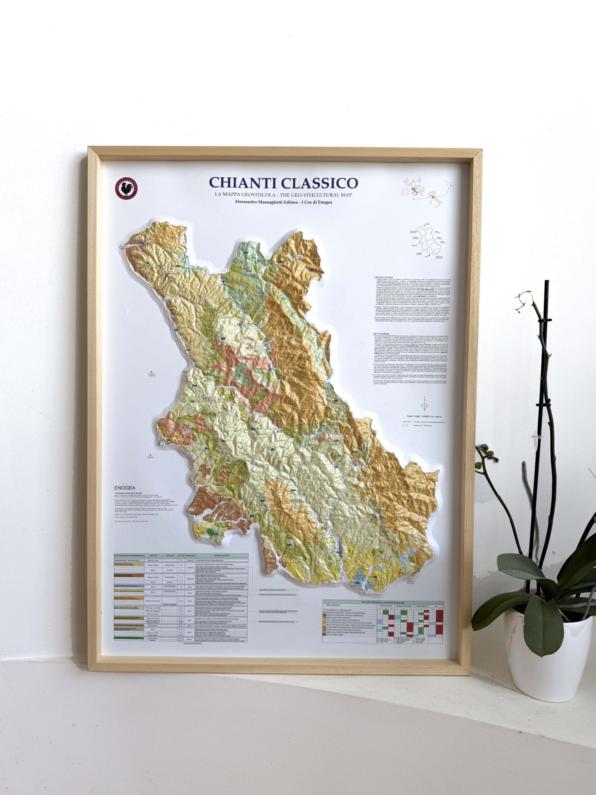 Un modo unico per conoscere ed esplorare il Chianti Classico, attraverso le sue valli, le colline e la geologia. Una mappa in rilievo estremamente accurata che non vi stancherete mai di guardare. Include una tabella delle formazioni geologiche e una tabella dei suoli.