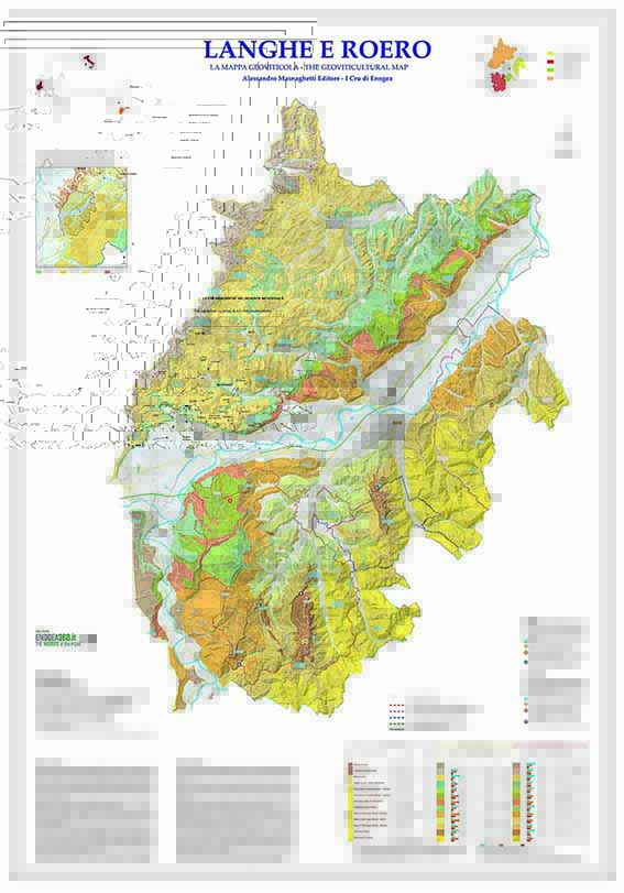La mappa che completa la trilogia delle carte geoviticole dell’Albese. Copre le aree di Barolo (incluse le parti dei comuni di Monforte d’Alba e di Novello non incluse nella DOCG), Barbaresco, Diano d’Alba e Roero. Include una mappa semplificata della geologia del Piemonte meridionale, una tabella con le caratteristiche dei suoli e i geositi.